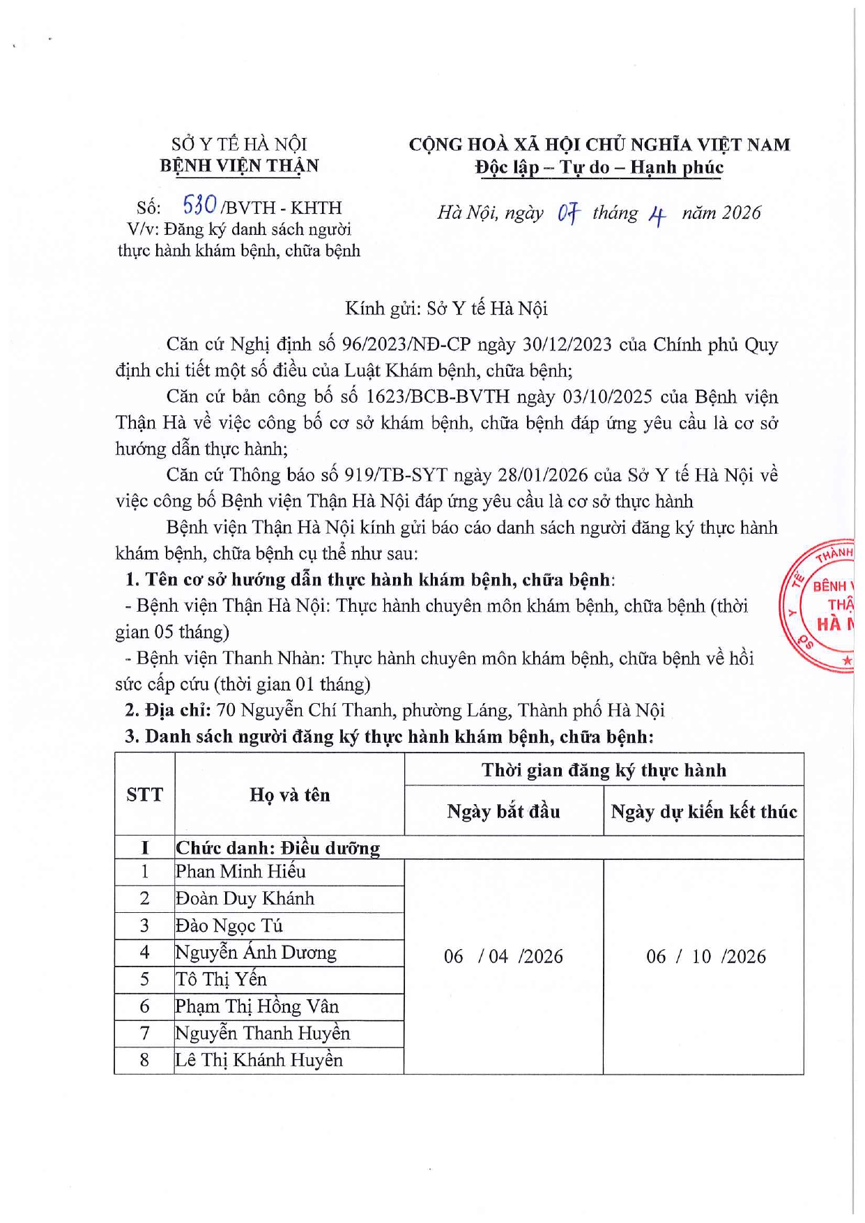 ĐĂNG KÝ DANH SÁCH NGƯỜI THỰC HÀNH KHÁM BỆNH, CHỮA BỆNH